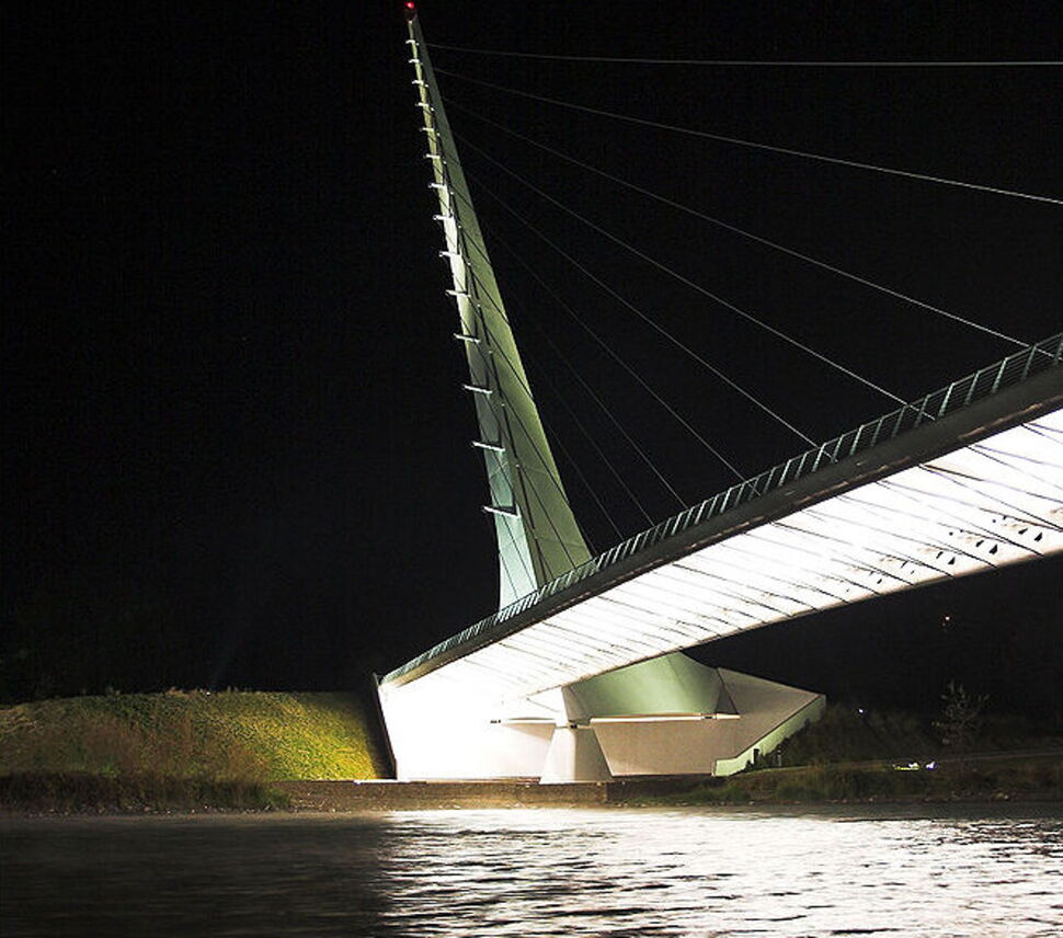 “It was Necessary Not to Disturb the Ecological Equilibrium” Calatrava’s entire design is exquisitely eco-friendly. Not wishing to impact the sensitive water temperature needs for the salmon breeding ground, Calatrava chose translucent glass paving tiles for the bridge surface. The sun’s rays pass through, without casting dark shadows on the water that might otherwise lower the temperature.