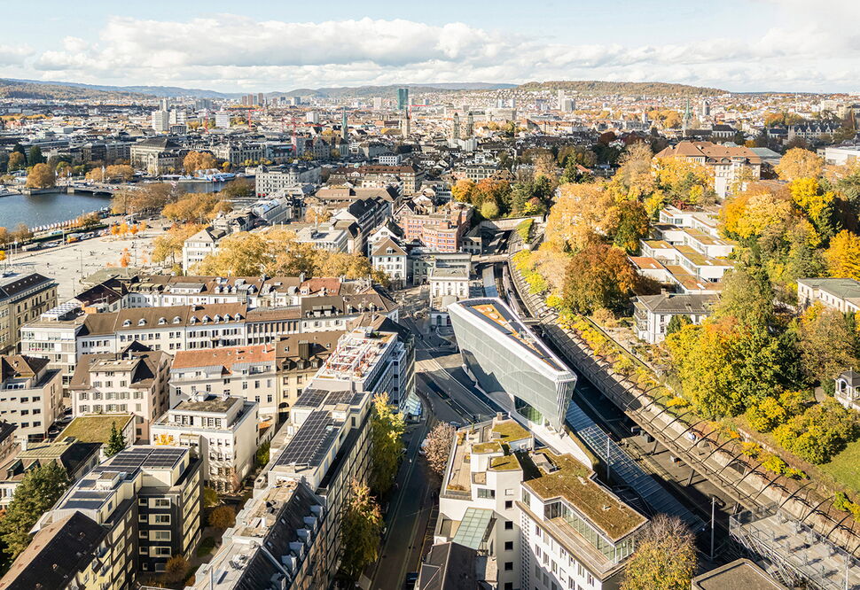 Under the building is one of the project’s most ambitious elements: three levels of parking for about 800 bicycles, an infrastructure in compliance with municipal strategies to reorganize bike traffic and remove open-air parking on Stadelhofer Platz, freeing up the square for exclusive pedestrian use. The site, narrow and with groundwater, required a highly complex plan for executing the foundation and the waterproofing.