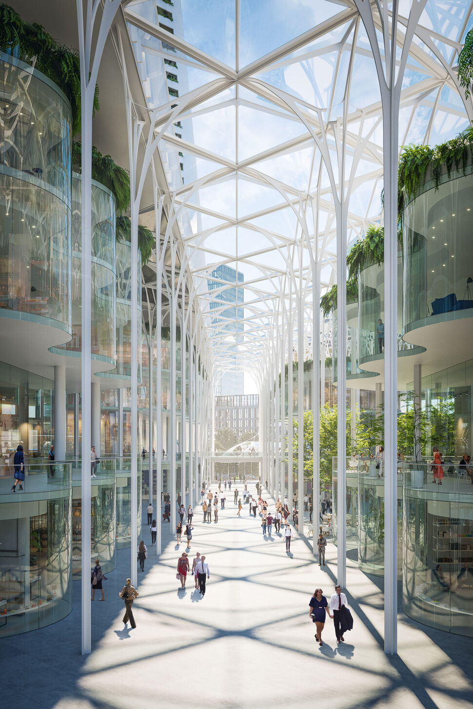 This major new landmark is set to transform Greenwich Peninsula, London’s emerging cultural district. Residents and visitors to the Peninsula will arrive from the tube into an 80ft high winter garden and glass galleria. The scheme will total 1.4 million sq ft including a new tube and bus station, theatre, cinema and performance venue, bars, shops and a wellbeing hub. Above this will rise three towers of workspaces, apartments and hotels, all connected to the Thames by a stunning new land bridge.